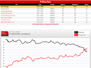 RCP’s polling data average showed the 78-year-0ld president’s approval rating in the negatives, with 48.4 percent disapproving and 47.4 approving, the week the crisis in Afghanistan reached a tragic, deadly breaking point resulting in 13 U.S. servicemembers killed — the largest single-day loss for U.S. servicemembers since 2011.