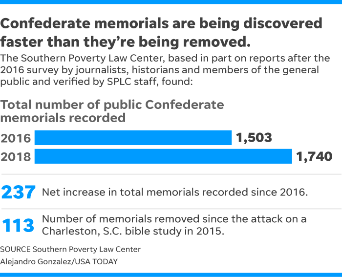 But today, the law center’s list of public Confederate memorials – monuments, place names, symbols, holidays – is 237 entries longer, at 1,740, than in 2016.